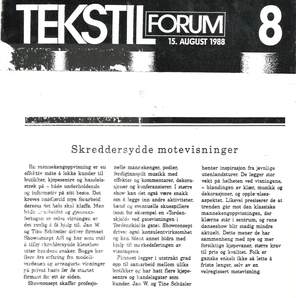 Utover 1988 befester Showconsept sin stilling og overtar etter hvert ansvaret for flere av prestisje-visningene i hovedstaden, blant annnet for Ferner Jacobsen, Jaqueline & Fabienne i Gamle Logen, designervisningene ved den bristiske ambassaden, Tordensskjolds dag og diverse show under mote-uken på Sjølyst. I tillegg produserer Showconsept sine populære fashion nights i hele 30 norske byer – et konsept som startet i 1987 og pågikk 2 ganger pr år frem til langt ut på 1990 tallet.